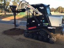 posi track planting auger, hand planting augers, staking with hardwood stakes, mulching, tree well installation, tying back with hessian & tree guards.